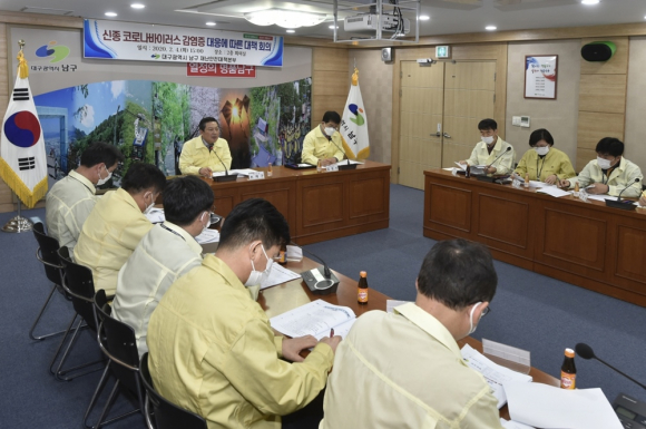 대구 남구는 국내외 신종 코로나바이러스감염증이 확산 방지 선제 대응을 위해 지난 4일, 구청 2층 회의실에서 전 부서 및 남부경찰서, 중부소방서 관계자와 재난안전대책본부 회의를 개최했다고 밝혔다.